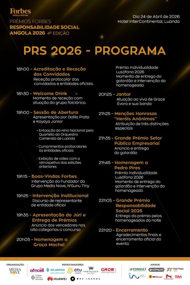 A excelência em responsabilidade social empresarial em Angola será hoje distinguida, na gala dos Prémios Forbes Responsabilidade Social 2026, que terá lugar no Hotel Intercontinental Luanda, no Miramar, a partir das 19h00. Num momento que cruza reconhecimento, prestígio e visão estratégica, serão conhecidos os vencedores entre 30 organizações finalistas, podendo uma delas conquistar o mais alto galardão da noite: o “Grande Prémio Responsabilidade Social 2026”.